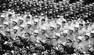 誓师大会上,北京市公安局局长马振川宣读了《北京市公安局国庆60周年安全保卫动员令》,相关领导还向治安、巡特警、消防、保安等各级安保代表授予“国庆安保突击队”队旗。(新华网)
