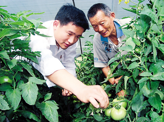 商水县袁老乡大学生村干部许海威在向村民讲解夏季西红柿的科学管理技术。去年以来,商水县选派了316名大学生下到农业生产第一线,被当地农民亲切地称为“贴心保姆”。(刘飞 摄)