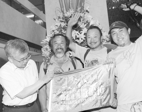6月28日,金飞豹(右二)和费宣(左二)抵达北京后和朋友合影。当日凌晨,云南知名探险家金飞豹和地质专家费宣探险成功,回到北京。他们历时80天,行程6700余公里,途经非洲六国,成功进行了穿越撒哈拉沙漠科考探险活动。 新华社记者 汪永基 摄