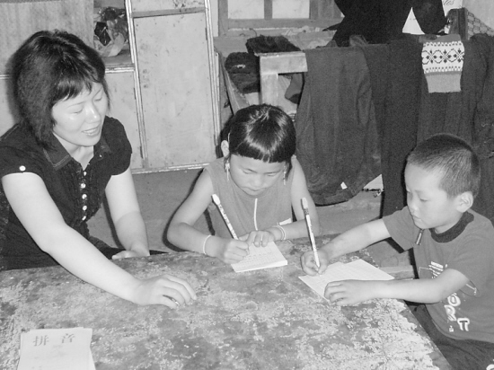 商水县舒庄乡杨庄村大学生村官李春艳是孤儿杨露露、杨留根姐弟俩的代理妈妈。去年以来,李春艳不仅资助姐弟俩上学,还坚持每周两次上门给他们辅导功课。(乔连军 摄)