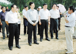 当天中午,宋璇涛冒着酷暑来到有“沙河第一险”之称的商水县老门潭险工所在地,详细了解有关情况。据有关人员介绍,该险工因处于沙河丁字型拐弯处,坐湾兜流,河底有深潭,历史上曾7次决口,危害巨大。1988年,我市建成7座网格坝抵挡洪水顶冲,取得了显著效果。日前,省水利厅又投资120万元对此处进行除险加固,目前正在紧张施工中,争取在大汛前发挥效益。