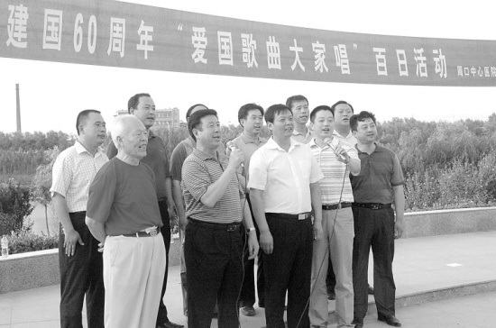 ▲为庆祝中华人民共和国成立60周年,市中心医院于近日举行“爱国歌曲大家唱”百日活动启动仪式,该院干部职工用歌声唱响时代主旋律,充分激发了大家的爱国激情。(记者 李寒 摄)