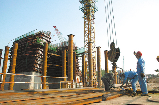 眼下,沙颍河大庆路大桥建设工程正在如火如荼进行中。据了解,该桥建成后可较大程度地缓解我市的交通压力,优化路网密度,进一步完善基础设施,提高城市品位。图为施工人员正在紧张施工。(记者 沈湛 摄)