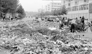 市民张先生说,光荣路与育新街交叉口设有临时垃圾存放点,但是堆积的垃圾远远超出了既定的存放范围,街道被弄得脏乱不堪。