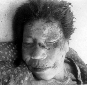 死者为女性,年龄50岁左右,短发稍黄,尸长154cm,上身穿青色白六边花外衣(左外下衣内有一黑色布钱包,包内装有21元人民币;右外下衣袋内有白色棉线一匝)内穿红色秋衣;下身穿灰色长裤。内穿红色秋裤和红色裤头,足穿花塑料小圆口鞋,右手带有一电子表。