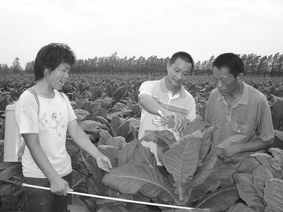 商水县袁老乡计生协会积极引导计生家庭成立农民专业合作社,有效解决了计生家庭在创业过程中的资金、技术和信息难题,走上了少生快富之路。图为老户庄村计生协会会长程国联在指导烟农科学管理烟叶。(刘飞)