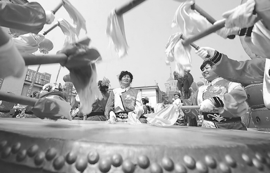 7月12日,晋机鼓乐团代表队选手在比赛中。当日,以“和谐、欢乐、奋进”为主题的山西省锣鼓大赛在太原市举行,来自全省各地的32支锣鼓队的2000余名选手将在为期两天的比赛中展开角逐。 新华社记者 燕雁 摄