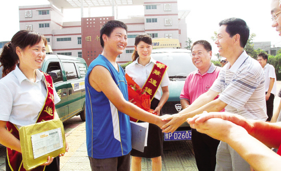 7月15日,我市高考文科第一名李登基接到香港中文大学的录取通知书,并获得了该校50万元港币的奖学金,他的老师第一时间向他表示祝贺。据悉,李登基是我市首位被香港中文大学录取的文科生。 (记者 王映 摄)