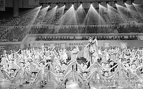 7月19日,比赛开始前演员们表演漳州民俗歌舞。当日,第四届海峡两岸青少年排球邀请赛在漳州举行。 新华社记者 沈汝发 摄