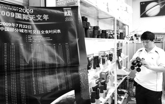 沈阳:望远镜商家择“日”赚钱 7月21日,一位消费者在沈阳一家望远镜专卖店里挑选观测日食用的望远镜。目前,沈阳的许多望远镜商店吸引了众多前来购买望远镜、滤光镜等日食观测设备的消费者。 新华社发