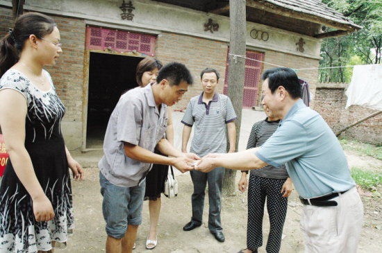 郸城县宜路镇王楼行政村8岁男孩牛子豪患上白血病,不仅无钱医治,而且很少吃到肉蛋食品,甚至从没吃到过水果。7月20日,消息传到了周口耳鼻喉医院院长王银邦那里,他不仅捐赠了3000元现金,而且为孩子带去了各种食品和水果,孩子的奶奶感动地下跪,并请求社会各界救救这个可怜的孩子。 (刘艳霞 摄)