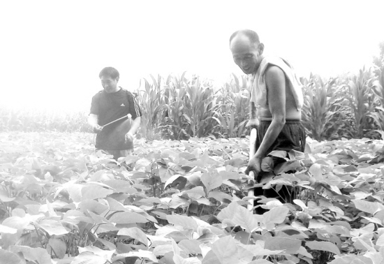 昨日,几位农民正在田间给秋季作物打药、锄草。目前,我市秋季作物长势喜人,秋粮丰收在望。 (记者 孙安平 摄)