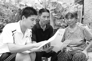 7月26日,商水县练集镇朱集村主任助理、大学生村干部陈书敬正在向村民讲解“4+2”工作法的内容。在推广“4+2”工作法中,商水县400多名大学生村干部融入群众,入户宣讲政策,收集意见,并积极协助村干部灵活运用“4+2”工作法做好当前的计生奖励对象普查、五保户对象认定、宅基地划分等工作。(吕耀光 李玉东 摄)
