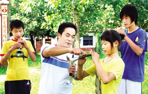 暑假期间,鹿邑县社会各界积极参与“关爱行动”,各尽所能丰富留守儿童的假期生活。图为该县太清宫镇留守儿童在职高校园内学习唢呐吹奏技巧。(蒋保庆 摄)