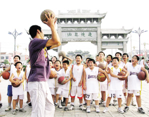 鹿邑县积极组织各文体单位举办中小学生暑假体育培训班,让中小学生度过一个愉快的暑假。图为体育老师在为喜爱篮球的孩子示范上篮动作。