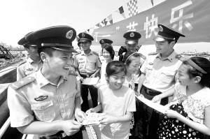 童心的祝福 7月30日,孩子们将自己亲手绘制的祝福卡片送给海警叔叔。当日,青岛市莘县路小学学生来到山东海警二支队警营与官兵们一起联欢,并送上写满真挚话语的祝福卡,共迎“八一”建军节。 新华社记者 李紫恒 摄