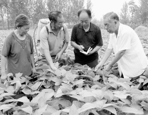 由于推广了良种良法,当前,鹿邑县百万亩秋季作物长势良好。图为农业专家在向农民讲解大豆的最佳种植模式。胡海云 摄