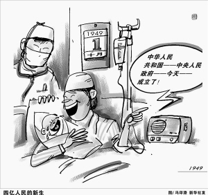 新华社播发的大型漫画以“新中国之路60年”为主题,以新中国同龄人为主人公,从新中国成立之日至今60年为线索,撷取主人公每年经见或参与的一件家、国事例,大处着眼,小处着手,通过记事,从不同角度和侧面反映新中国所走过的艰难、曲折而伟大的道路。本报从今日起开设栏目《新中国同龄人的记忆》。