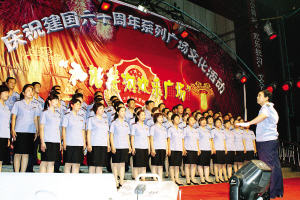 为庆祝建国60周年,扶沟县委宣传部联合该县24家省、市级文明单位,从7月21日开始,陆续举办24场以“和谐扶沟,欢乐广场”为主题的红歌会。图为该县工商人员正表演大合唱《歌唱祖国》。(卢付昌 摄)