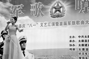 7月27日下午,由太康县委宣传部、太康县人武部主办,太康县民政局承办的“军歌嘹亮”庆“八一”文艺汇演暨首届军旅歌曲大奖赛颁奖典礼在该县人民广场举办。图为参赛选手正在演唱。