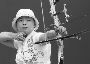 8月9日,韩国队选手尹玉姬在比赛中。当日,在2009国际箭联射箭世界杯赛(上海站)反曲弓混合团体决赛中,韩国队选手尹玉姬/吴真赫以153环比141环战胜中国队选手陈文园/赵玲,夺得冠军。