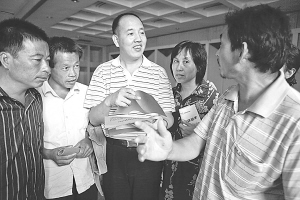 8月15日,全国人大代表、“农民工司令”张全收回到家乡河南省驻马店市,与当地劳动部门和乡镇政府联合举办招工推介会,希望招收5000名农民工南下务工。张全收在深圳创办经营的劳务派遣公司是中国最大的农民工劳务公司,以对农民工实行收入保障制度和团队输出的产业化经营方式,创下“农民工权益保全”新模式:公司先将工人招进来,哪个工厂要人,再将工人“打包”过去,没活干的时候,免费为工人提供吃住,并且每天有补助。 新华社发(张晓理 摄)