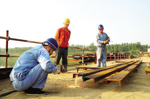 在沙颍河大庆路桥建设过程中,管理和施工人员坚持把工程质量放在第一位,为打造精品工程奠定了基础。图为工作人员在认真施工。(记者 王映 摄)