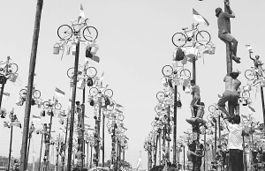 8月17日,在印度尼西亚首都雅加达,参赛者在攀爬油滑的杆子。当天,近2000名年轻人在雅加达北区一个公园内参加“叠罗汉”比赛,庆祝国家独立64周年。新华社发