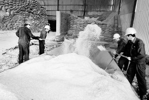 8月19日,工人们将谷壳铲入料斗送进锅炉当燃料使用。 位于江西湖口县的力山环保科技有限公司投巨资开展农业废弃物再利用项目,将谷壳、棉籽壳、秸秆当作燃料,改变以往用煤炭做燃料的方式。据了解,该项目自2007年投产以来,每年可利用废弃谷壳4.1万吨、废植物油6万吨,仅谷壳这一项就可使农民从中增加收入1230万元。 (新华社发 胡国林 摄)