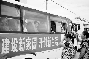 南水北调中线工程湖北库区移民开始搬迁 8月20日,均县镇关门岩村的移民乘车前往安置点。当日,湖北省丹江口市均县镇和习家店镇移民开始搬迁,南水北调中线工程湖北库区首批移民搬迁由此启动。 新华社记者 郝同前 摄