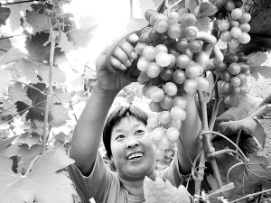 商水县练集镇朱集行政村计生户蔡畅,在镇计生协会的帮助下种植了10亩葡萄,亩均收入1万多元。图为蔡畅在喜摘葡萄。(闫治凯 刘飞 摄)