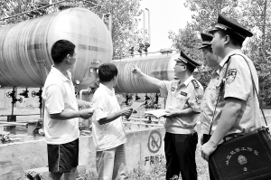 为确保国庆消防安全,市公安局沙北分局金海路派出所民警利用周末休息时间,对辖区内的液化气站、烟花爆竹仓库等易燃易爆场所进行检查。(郁发顺 摄)