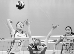 8月23日,中国队球员马蕴雯(左)在比赛中进攻。当日,在日本东京举行的2009年世界女排大奖赛总决赛中,中国队以1比3负于德国队,从而以1胜4负的战绩结束了本次总决赛的五轮比赛。