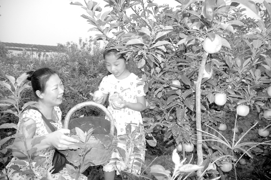 近年来,黄泛区农场大力发展林果业,既取得显著的经济效益,又改善了农场生态环境。图为来自周口市区的一对母女在果园体验采摘鲜果的乐趣。 (记者 李寒 摄)