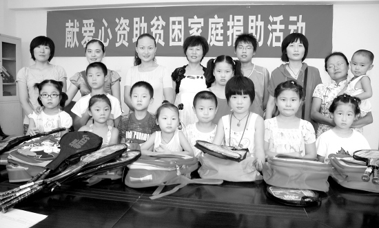 昨日,川汇区七一路办事处辖区10名接受捐助的贫困学生见到了资助自己上学的“爱心妈妈”。“爱心妈妈”还给他们送去了书包、羽毛球拍等礼物。 记者 孙安平 摄
