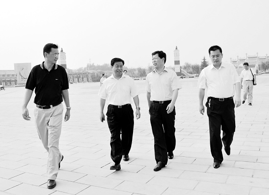 8月25日,国家开发银行河南省分行行长王卫军(左一),周口市委常委、常务副市长王申亭(右二)在鹿邑县委书记杨廷俊(左二)、县长刘政陪同下在老子文化广场参观考察。当日,王卫军一行考察了该县的老子文化开发工作。(闫子健 摄)