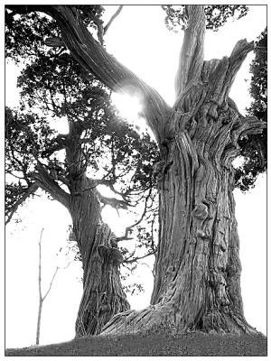 此二柏为圆柏,又叫桧柏,树龄1380年。两古柏东西相照,间距1.7米,东株树身向东南方向倾斜,西株向西方向倾斜。树干形似无皮,纹如缠藤,其状甚古。古柏于1958年被当地群众锯去大部分枝杈,仅余主干。后在主干上生出了嫩枝,今郁郁葱葱,生机勃勃,枝叶与主干形成了强烈反差,颇为美观,为国家一级保护古树。