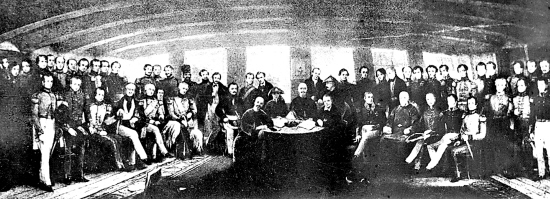 1842年8月29日,清朝政府派钦差大臣与英国代表在南京签订了结束鸦片战争的丧权辱国的中英《南京条约》,条约共13款,主要内容有:割让香港,向英国赔款2100万银元等。从此,中国沦为半殖民地半封建国家。后人称这一天为国耻日。这是中英签订《南京条约》的图画。 新华社发
