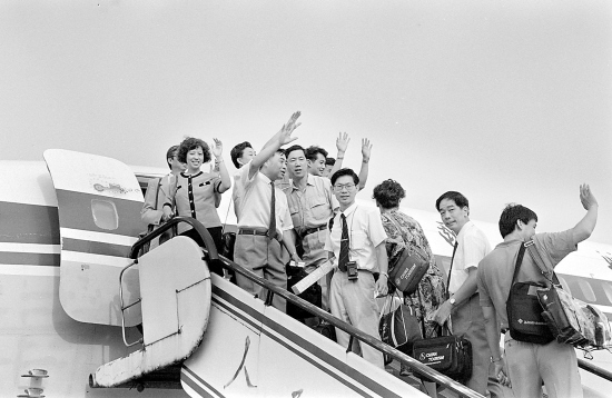 1992年9月3日,应中国台湾“海峡交流基金会” 的邀请,由人民日报、新华社、中国记协等17家新闻单位的18名记者组团乘机离京赴台。这是海峡两岸分离43年后大陆记者首次组团赴台采访。图为大陆记者赴台采访团成员登机离京(资料照片)。新华社发