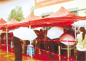 一组组客户走出售楼部,又一组组客户进入,外面的队伍仍络绎不绝地有人加入,排号活动一次次被推向高潮。