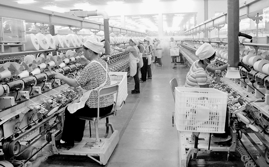 周口农业资源丰富,粮、棉、油等农产品产量均居全国前列。市委、市政府充分发挥资源优势,调整产业结构,拉长产业链条,着力培育具有市场竞争力和有知名度的名牌产品,把周口打造成优质农副产品精深加工基地。图为纺织工人正在车间工作。(记者 孙安平 摄)