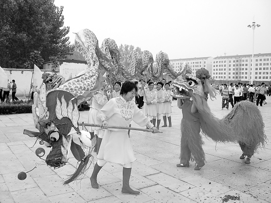 连日来,商水县积极组织文艺宣传队开展“送文艺,唱红歌”活动,迎接祖国60华诞的到来。图为县人口计生委组织的计生文艺宣传队在进行舞龙狮表演。 (刘飞 摄)