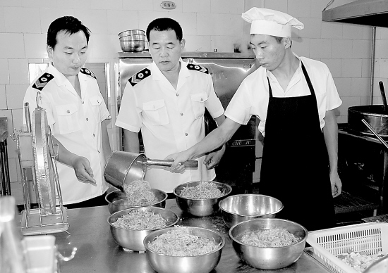 昨日,周口市卫生监督处的工作人员在市某幼儿园食堂检查食品卫生情况。日前,市直学校刚刚开学,市卫生监督处组织工作人员到各个学校进行食品卫生、幼儿用品消毒等检查,以确保学生们的卫生安全。 (记者 孙安平 摄)
