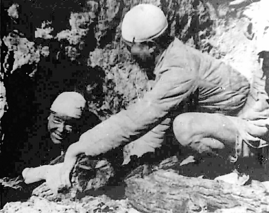 1944年9月5日,实践我党我军全心全意为人民服务宗旨的典范、共产主义战士张思德,在陕北安塞县山中执行烧炭任务时,因炭窑崩塌不幸牺牲,时年29岁。3天后,毛泽东主席在张思德的追悼会上作了《为人民服务》的著名演讲。张思德是四川仪陇人,1933年参加红军,参加过长征。图为和战友一起烧炭的张思德(左)。(资料照片) 新华社发