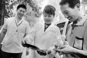 市人民医院农合办工作人员热心为患者服务,及时为参合患者发放医疗补偿款。图为工作人员上门为参合农民办理大额医疗补偿款。 (陈卫东 摄)