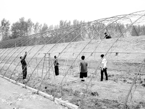 商水县姚集乡发挥本乡万亩蔬菜生产基地优势,积极开展“幸福家庭行动”,为当地菜农提供资金、技术、信息、销售“一条龙”服务,帮助其新建高标准日光温室500个,占地1500亩,并成立了商水县金昌蔬菜种植农民专业合作社,实行订单种植。图为几名施工人员正在为日光温室焊接钢筋棚架。