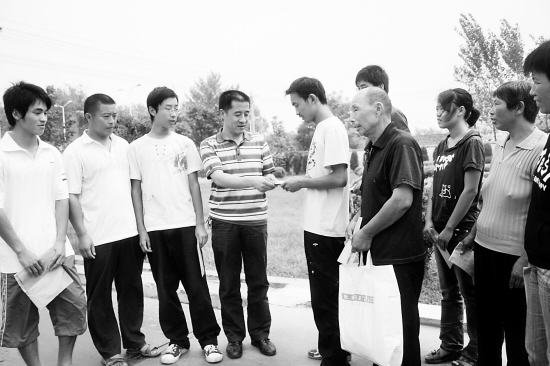 在商水县工商联的主持下,商水县私营企业纷纷伸出温暖的双手,援助贫困大学生走进大学校园。图为商水县爱普饲料公司拿出3万元善款,帮助13名贫困大学生解决实际困难。(魏红 摄)
