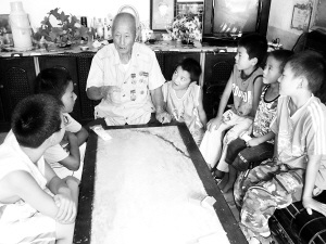 9月6日上午,商水县舒庄乡扶苏村10多名留守儿童早早来到老军人王海斌爷爷家里,听他讲战斗故事。曾参加过解放战争并立过两次大功的王海斌老人经常利用星期天、节假日或茶余饭后,为留守儿童讲革命故事,对他们进行爱国主义教育。(乔连军 摄)