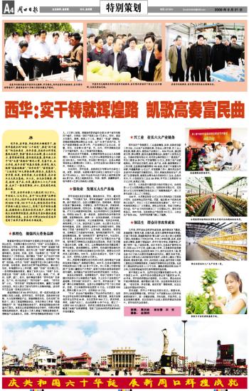 新中国成立60年,是西华县走向繁荣昌盛的60年;新中国成立60年,是西华县各项建设事业突飞猛进的60年。60年来,西华县经济建设由弱到强、由小到大,群众生活水平逐步得到改善,城市建设日新月异,社会服务体系更加完善,“老有所养、学有所教、病有所医”得到实现,社会主义新农村建设有序进行。