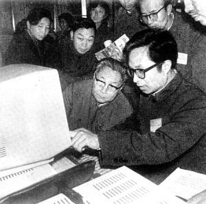 1983年,河南省取得重大科研成果,五笔字型汉字编码方案研究实验成功。图为国务院大规模集成电路和计算机领导小组办公室人员听取新方案创制人王永民(右)的汇报。